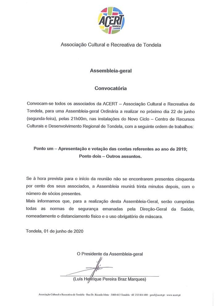 Convocam-se todos os associados da ACERT – Associação Cultural e Recreativa de Tondela, para uma Assembleia-geral Ordinária a realizar no próximo dia 22 de junho (segunda-feira), pelas 21h00m, nas instalações do Novo Ciclo – Centro de Recursos Culturais e Desenvolvimento Regional de Tondela, com a seguinte ordem de trabalhos: