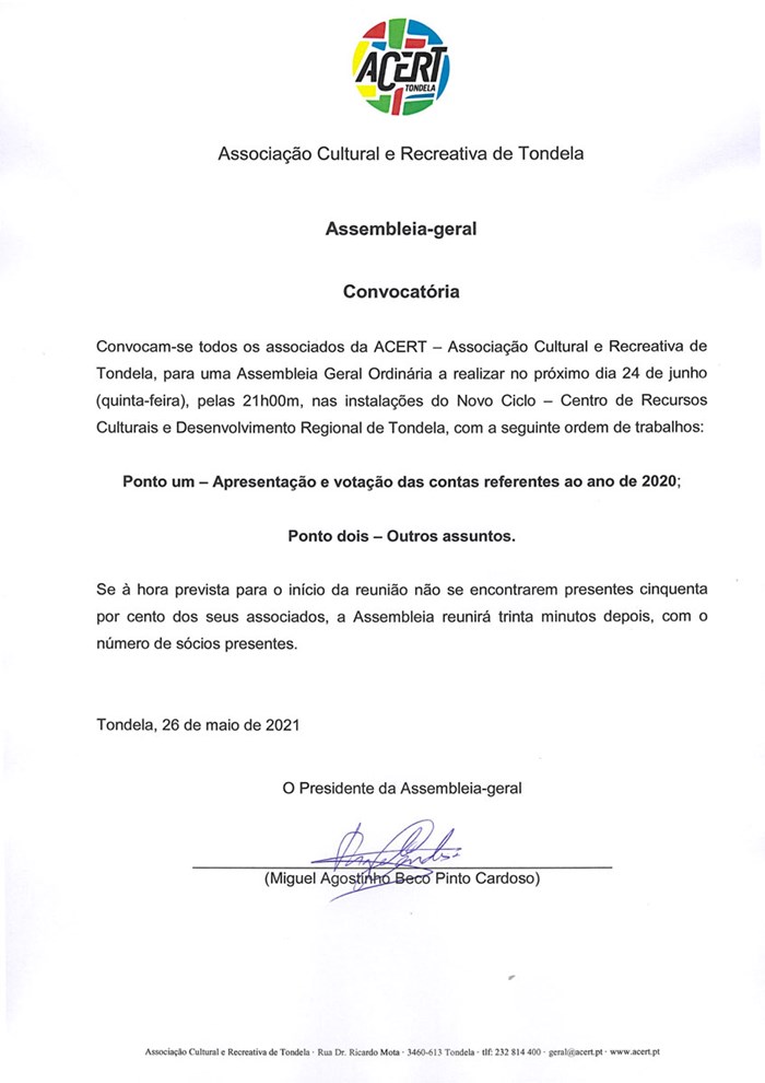 Convocam-se todos os associados da ACERT – Associação Cultural e Recreativa de Tondela, para uma Assembleia Geral Ordinária a realizar no próximo dia 24 de junho (quinta-feira), pelas 21h00m, nas instalações do Novo Ciclo – Centro de Recursos Culturais e Desenvolvimento Regional de Tondela, com a seguinte ordem de trabalhos: