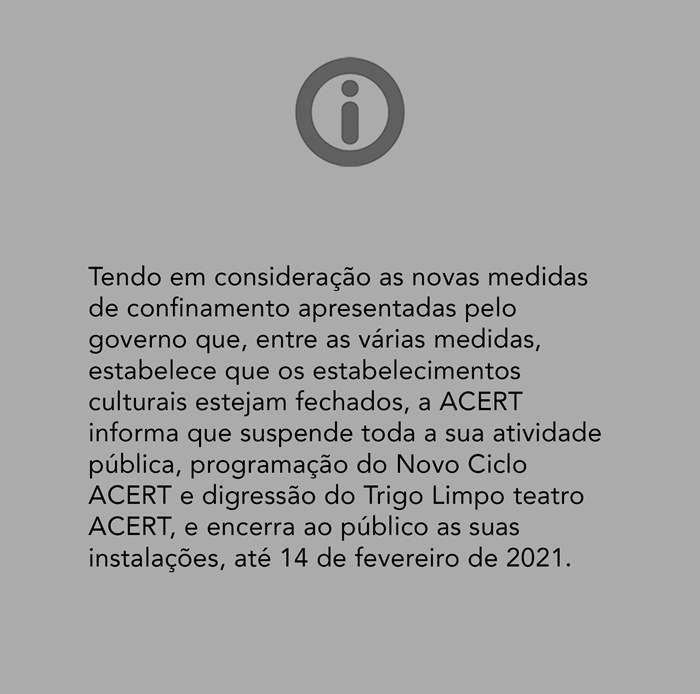Tendo em consideração as novas medidas de confinamento apresentadas pelo governo que, entre as várias medidas, estabelece que os estabelecimentos culturais estejam fechados, a ACERT informa que suspende toda a sua atividade pública, programação do Novo Ciclo Acert e digressão do Trigo Limpo teatro Acert, e encerra ao público as suas instalações, até 28 de fevereiro de 2021.
