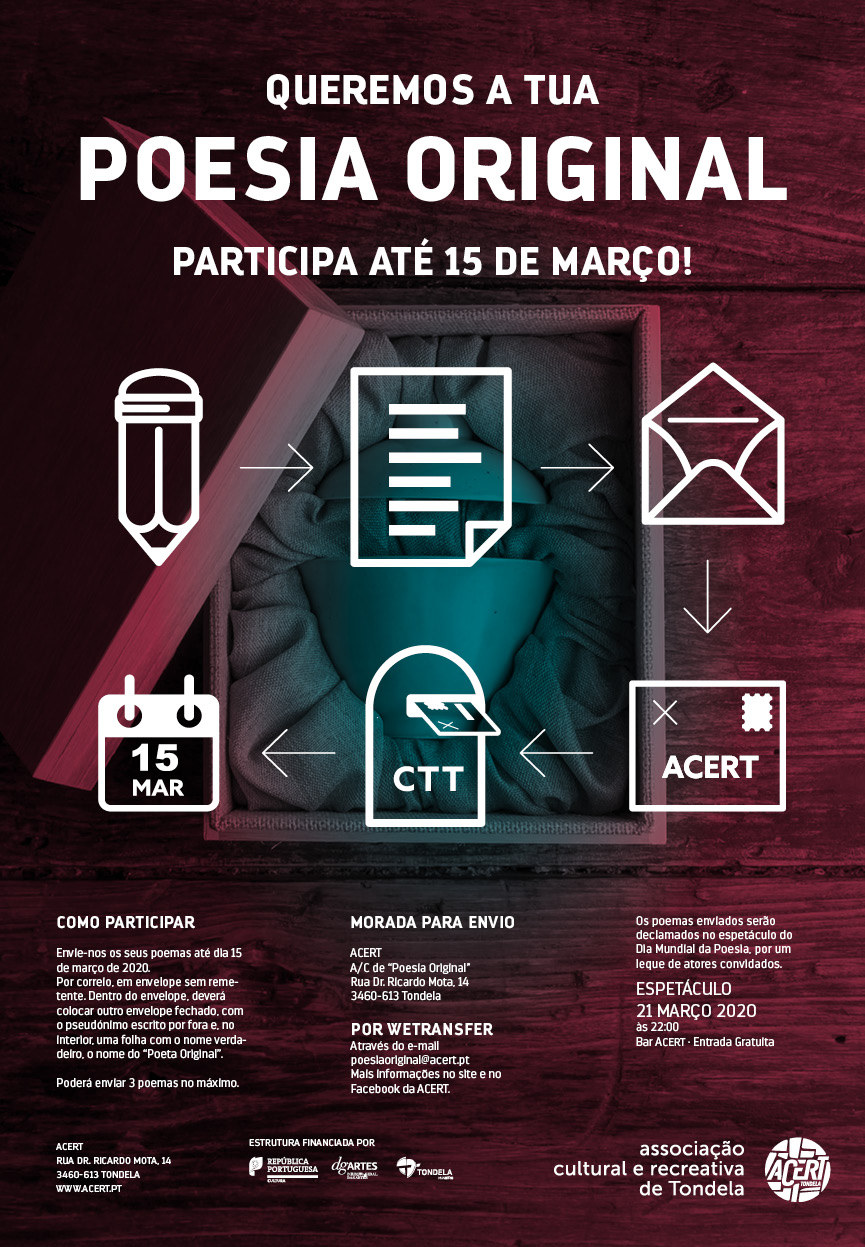 Nessa noite todos podem ser “Poetas originais” desse espetáculo! Sim, porque todos nós um dia já escrevemos um poema, ou porque tivemos um desgosto de amor, ou porque achámos que tínhamos uma revolução por fazer, ou simplesmente porque quisemos experimentar escrever um “Poema Original” como expressão da nossa intimidade e, como tal, foram todos para a gaveta… Acontece a todos.