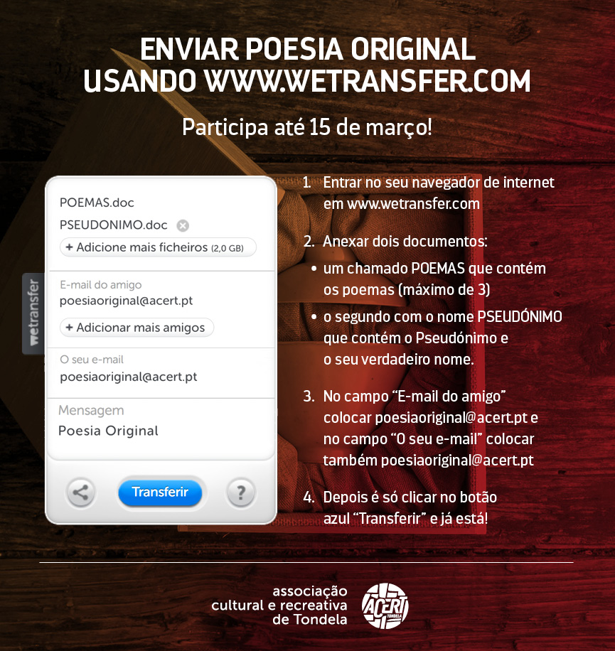 Envie os seus poemas por correio, em envelope sem remetente. Dentro do envelope, deverá colocar outro envelope fechado, com o pseudónimo escrito por fora e, no interior, uma folha com o nome verdadeiro, o nome do “Poeta Original”.