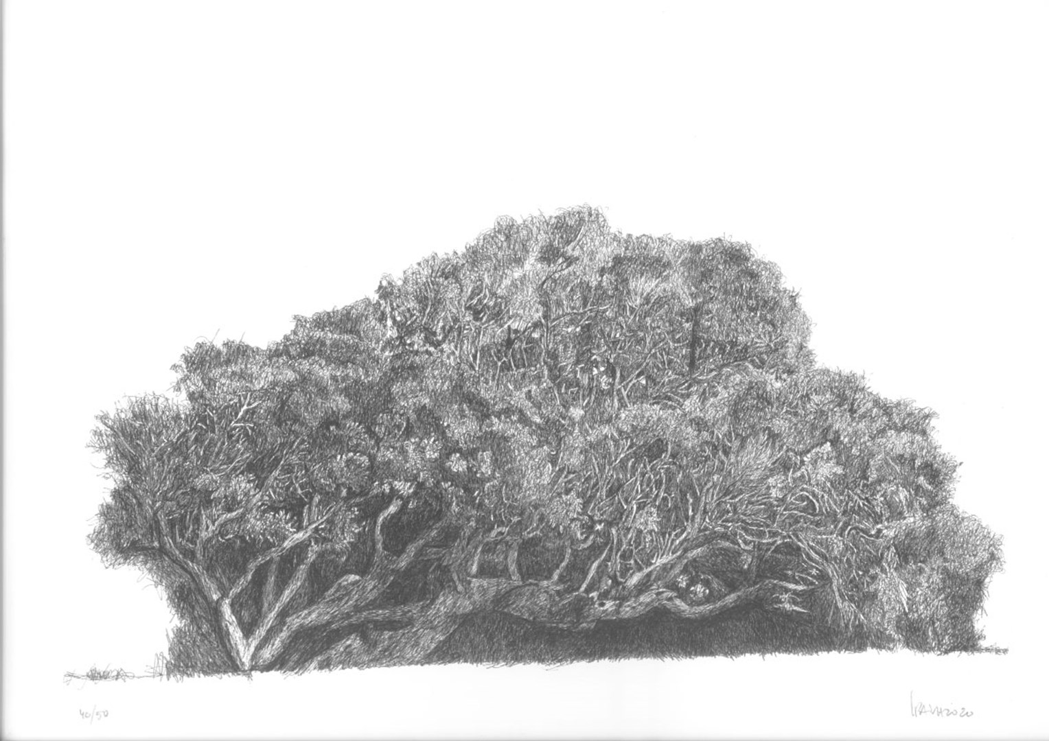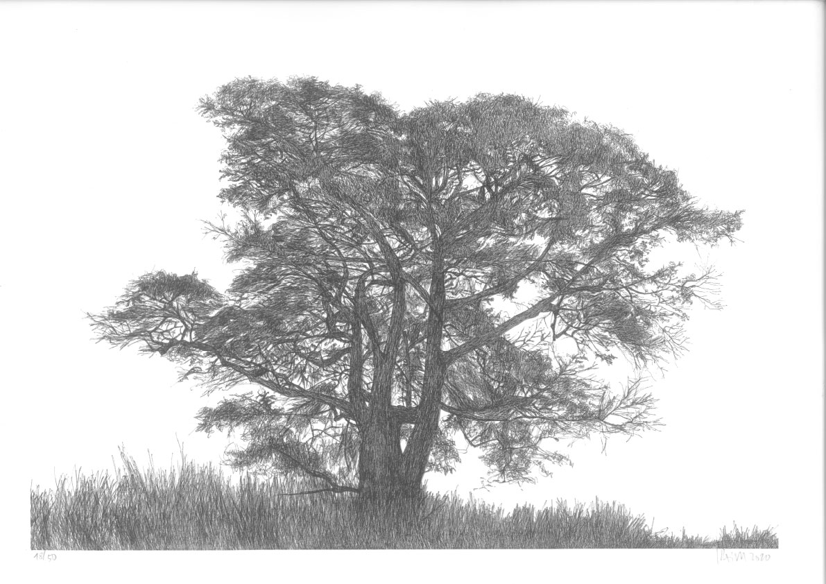 Desenho na lentidão – árvores. Embora sejam cor sépia, eu só vejo verdes. São pequenos pontos de mãos dadas em linhas, mas na minha perceção são manchas. O suporte é papel aquecido pelos mimos da caneta incansável, mas eu sinto fresco.