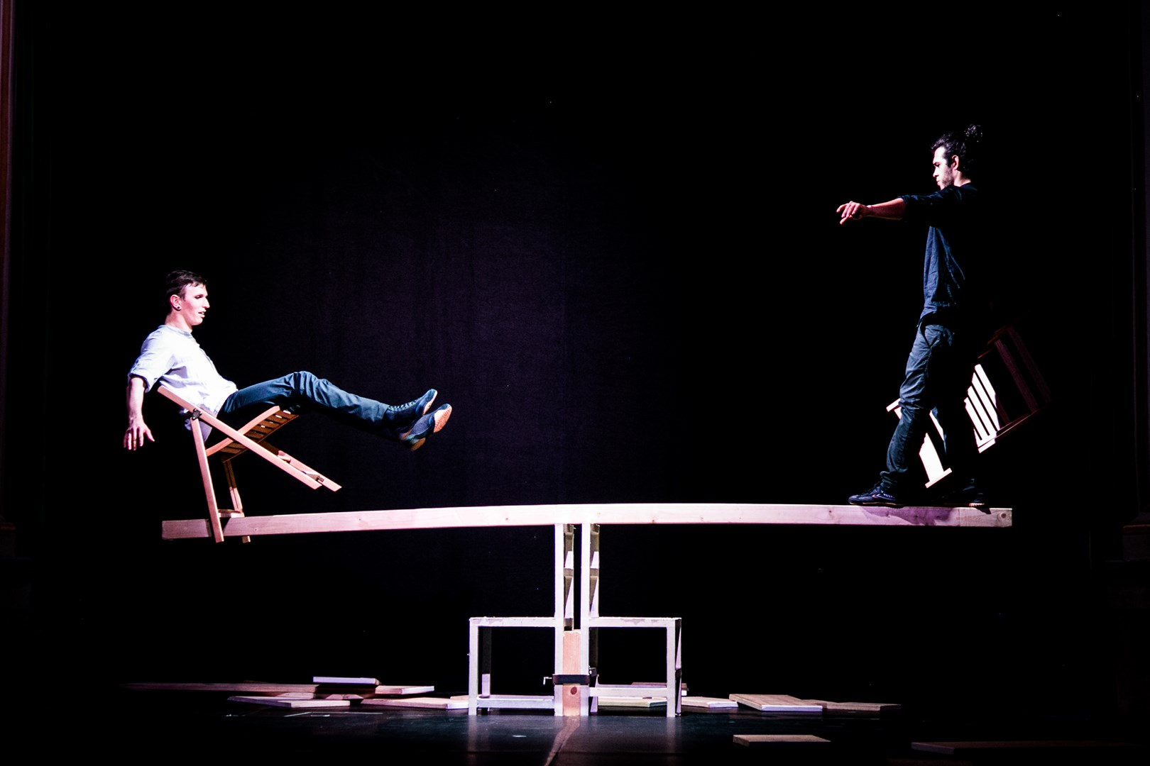 Em cena temos duas personagens e uma arquitectura de pranchas de madeira. Uma imagem surrealista e minimalista ao mesmo tempo e uma estética elegante na qual se desenvolve um jogo extremo: a procura dos limites do equilíbrio entre os corpos e as construções geradas com as pranchas de madeira.